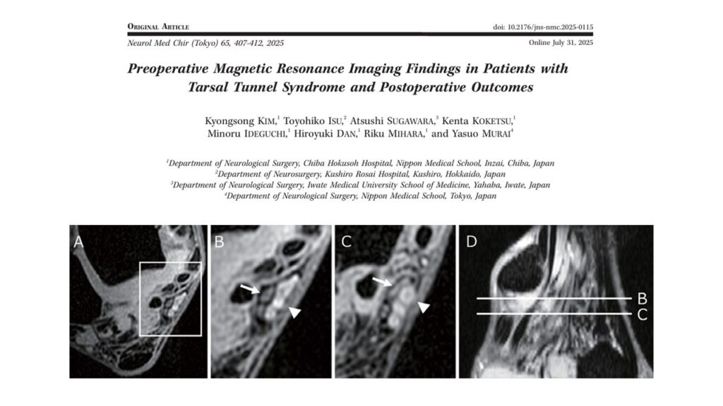 金景成先生の論文(Preoperative Magnetic Resonance Imaging Findings in Patients with Tarsal Tunnel Syndrome and Postoperative Outcomes)がNeurol Med Chir (Tokyo)に掲載されました。足根管症候群に対する術前MRI所見と術後成績の関連を検討しました。特にT2*脂肪抑制画像における神経高信号の有無に注目し、症状改善との関係を解析しています。神経幅径の狭小化自体と術後予後は相関せず、高信号所見が予後良好の指標となる可能性が示されました。MRI所見を術前診断や手術適応判断に活用できる可能性を報告しました。