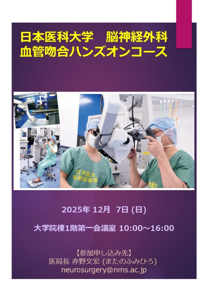 2025年12月7日(日) 10:00-16:00 に日本医科大学大学院棟で血管吻合のハンズオンを行います。